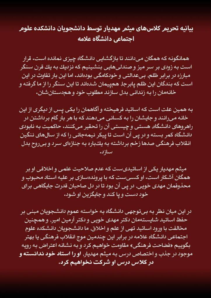 در این میان نظر به بیتوجهی دانشگاه به خواسته عموم دانشجویان مبنی بر حفظ اساتید شایستهمان دکتر #مهدیخویی و دکتر #آرمینامیر، و همچنین مخالفت با ورود اساتید تهی از علم و اخلاق، ما دانشجویان دانشکده علوم اجتماعی دانشگاه علامه در برابر این چندمین موج انقلاب فرهنگی یا بهتر بگوییم «فضاحت فرهنگی» مقاومت خواهیم کرد و به نشانه اعتراض به رویه موجود در جذب و اختصاص درس به میثم مهدیار، او را استاد خود ندانسته و در کلاس درس او شرکت نخواهیم کرد.»