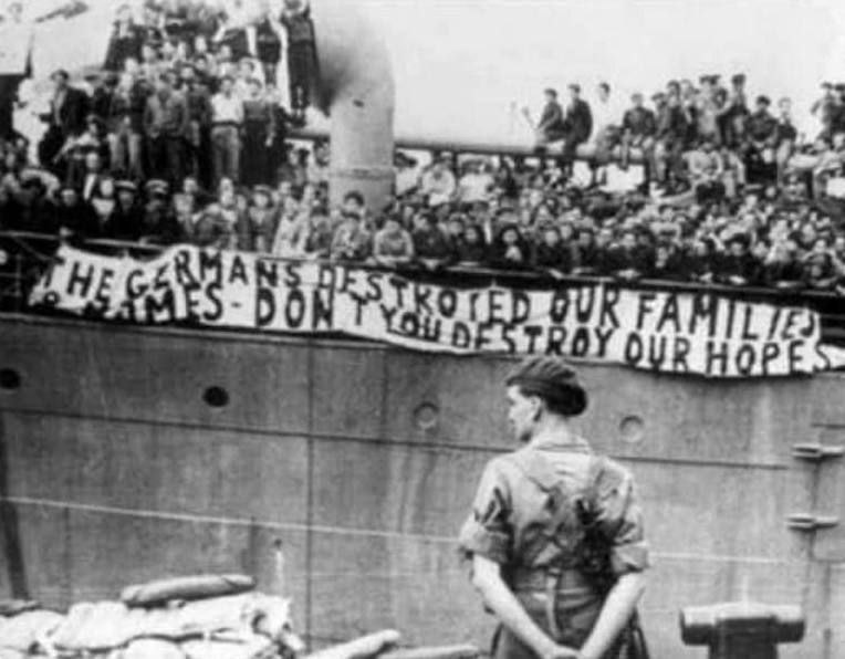 این عکس مربوط به سال ۱۹۴۷ میلادی برابر با ۱۳۲۵ خورشیدی است. اینجا «بندر حیفا» واقع در شمال کشور فلسطین است. تعداد ۴۵۰۰ یهودی که از کشور آلمان اخراج شده و پناهندهی کشور فلسطین شدهاند، روی یک پارچهی بزرگ که روی عرشهی کشتی نصب شده نوشتهاند: »کشور آلمان، خانه و آشیانهی ما را نابود کرد، لطفا شما فلسطینیان، امید ما را نابود نکنید!» —————————- زهی شرم که اینک پس از ۷۶ سال و پس از جنگهای خونینی که اسرائیلیهای افراطی که خود را قوم برگزیده میدانند راه انداختهاند، در این روزگار وارونه، نه تنها دولتهای مختلف اسرائیل منکر کشور فلسطین شدهاند، بلکه با استناد به آیینهای دروغین ساختگی، خاک فلسطین را سرزمین موعود خویش میدانند!