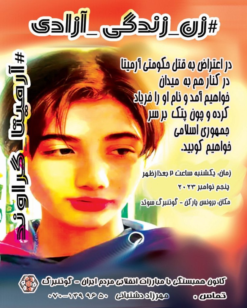 به دعوت : کانون همبستگی با مبارزات انقلابی مردم ایران – گوتنبرگ ، در روز یکشنبه پنجم نوامبر ساعت 14 به خیابان می آییم تا به قتل عمد حکومتی #آرمیتا_گراوند اعتراض نماییم ! شما را نیز فرا می خوانیم با ما همصدا شوید !