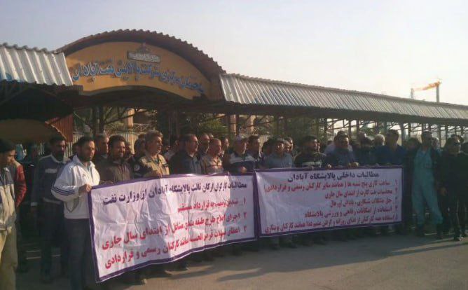 این کارگران به عقب افتادن دستمزدهای خود و موضوع مغایرت لیست بیمه شان اعتراض دارند و خواستار پیگیری وضعیت استخدامی خود هستند . شایعات در مورد افراد سفارش شده که با دستور مستقیم مدیرعامل پالایشگاه تبدیل وضعیت شدند، به این اعتراضات شدت بخشیده است. خواسته های کارگران اصلاح طرح طبقه بندی مشاغل، صدور نفت کارت و بن کارت، دریافت تسهیلات کم بهره همانند کارگران رسمی و قراردادی و همکاری در ایجاد تعاونی مسکن هستند. پنجشنبه ۱۶ آذر