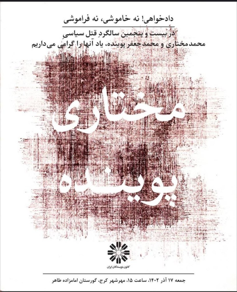 پوستر کانون نویسندگان ایران به مناسبت ۲۵ سال دادخواهی جانباختگان راه آزادی بیان بی هیچ حصر و استثناء؛ محمد مختاری و محمدجعفر پوینده
