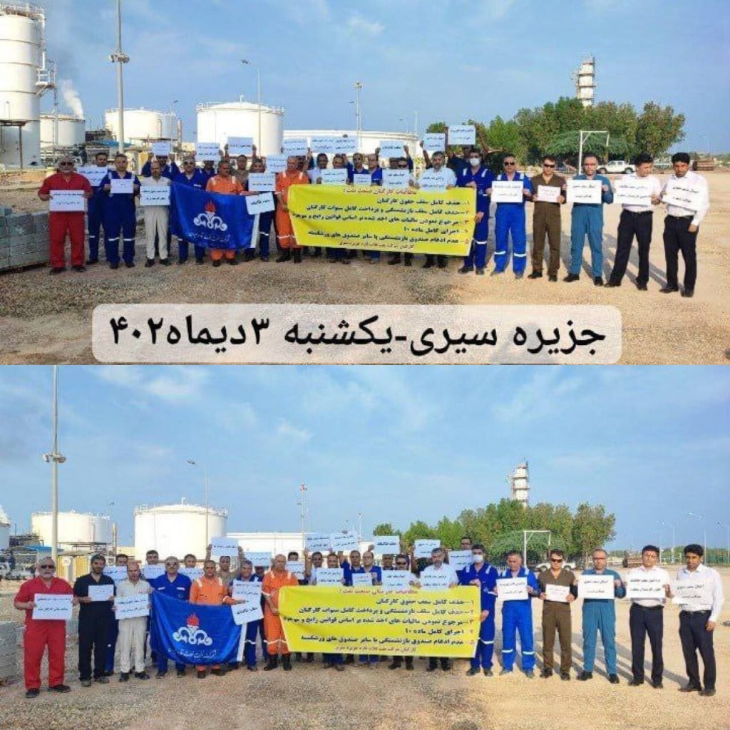 کارکنان شاغل در شرکت نفت قاره ایران در جزیره سیری علیه ظلم و بیعدالتی جمهوری اسلامی همچنان ایستادهاند و خواهان تحقق مطالبات خود هستند. کارکنان معترض خواهان حذف کامل سقفحقوق، حذف محدودیت حقسنوات بازنشستگی، عودت کسورات مازاد مالیات، اجرای کامل ماده ۱۰ و پرداخت بکپی، عدم دستدرازی به صندوق بازنشستگی کارکنان نفت هستند.