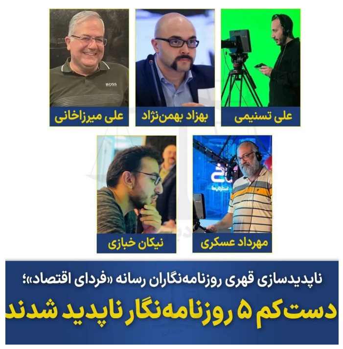 دستکم پنج روزنامهنگار ناپدید شدند. گزارشها از ناپدید شدن دستکم پنج روزنامهنگار در نتیجه حمله دو روز گذشته ماموران امنیتی به رسانه «فردای اقتصاد» در تهران خبر میدهند. بر اساس گزارشها پس از گذشت بیش از ۷۲ ساعت از ورود ماموران امنیتی به دفتر روزنامه فردای اقتصاد، هیچ اطلاعاتی از علی تسنیمی، نیکان خبازی، مهرداد عسکری، بهزاد بهمننژاد و علی میرزاخانی، پنج روزنامه نگار این رسانه در دست نیست.