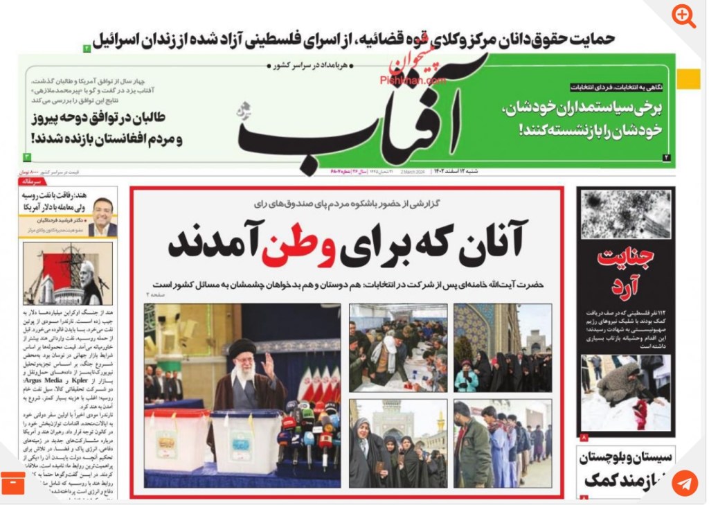 روزنامه آفتاب برای این روز از تیترهای «برخی سیاستمداران خودشان خودشان را بازنشسته کنند» و «سیستان و بلوچستان نیازمند کمک» استفاده کرد. این روزنامه در میان صفحه خود به نقل از خامنه ای نوشت: «هم دوستان و هم بدخواهان چشمشان به مسایل مملکت است.»