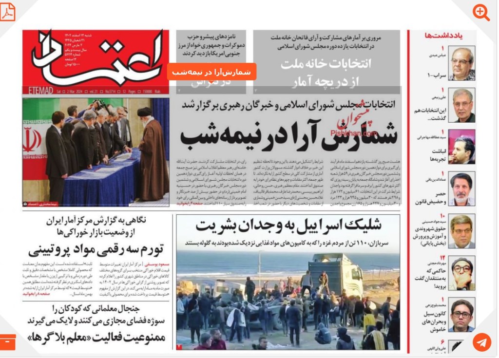 روزنامه اعتماد «تورمِ سه رقمی مواد پروتینی» و «جنجال معلمانی که کودکان را سوژه فضای مجازی می کنند و لایک می گیرند» را در کنار «شمارش آرا در نیمه شب» به عنوان تیترهای صفحه اول برگزید.