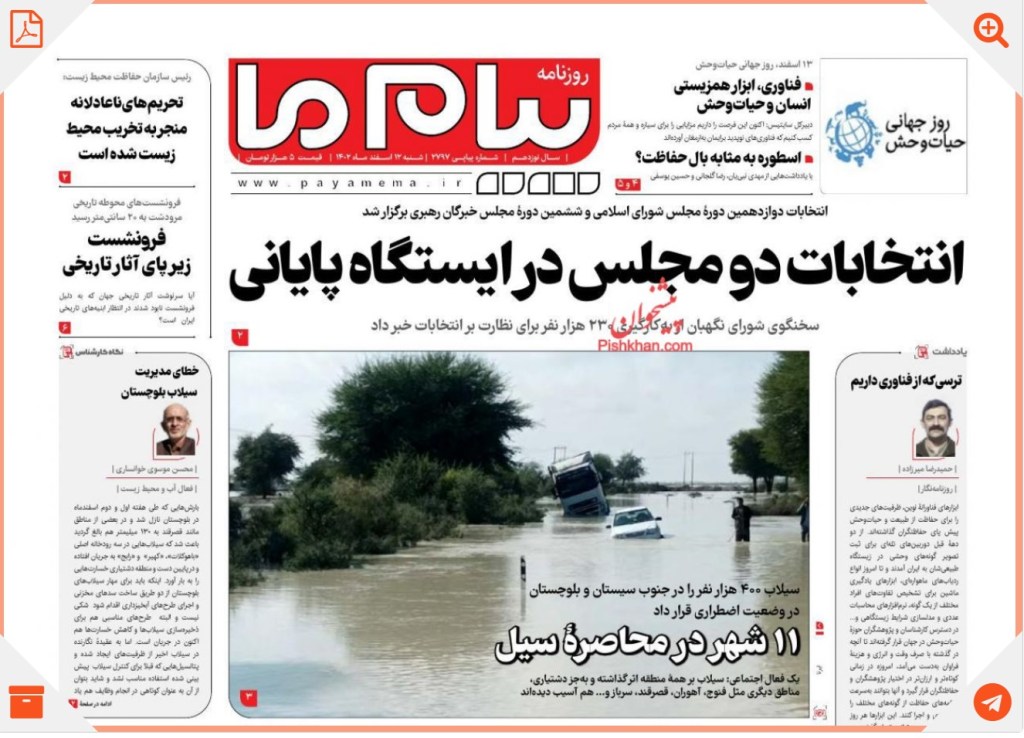 «انتخابات دو مجلس در ایستگاه پایانی» در کنارِ «تحریم های ناعالانه منجر به تخریب محیط زیست شده است»، «فرونشست زیر پای آثار تاریخ»، «خطای مدیریت سیلاب بلوچستان»، و « یازده شهر در محاصره سیل» تیترهای اصلی روزنامه پیام ما را تشکیل دادند.