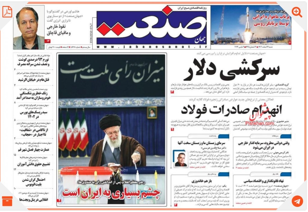 جهان صنعت صفحه اول خود را عکسی از خامنه ای و اینکه او گفته چشم بسیاری به ایران است، در کنار تیترهای «سرکشیِ دلار»، «انهدام صادرات فولاد»، «نفوذ خارجی و مافیای قاچاق»، « تورم نود و سه درصدی گوشت و نصف شدن سرانه مصرف»، «زنگ خطر ورشکستگی خودروسازان به صدا درآمد»، «از ناکامی در شفافیت تا اجبار در حجاب»، «احتمال گران شدن بلیت اتوبوس»، و «سبد ریسک های بورس در 1402» را در صفحه اول به چاپ رساند.
