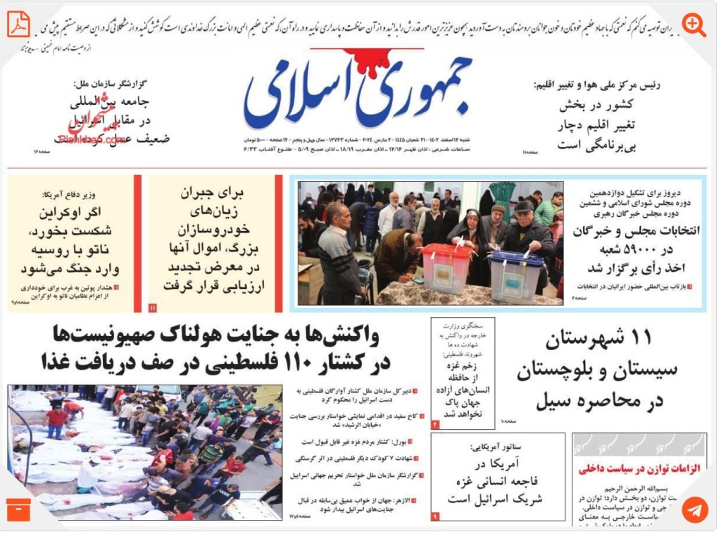 جمهوری اسلامی صفحه اول خود را بیشتر به خبرهائی از ینگه دنیا تخصیص داد. «زیان خودروسازان، سیل در سیستان و بلوچستان» و خبری در مورد «برگزاری انتخابات در پنج هزار و نهصد شعبه اخذ رای» هم دیگر تیترهای این روزنامه را تشکیل دادند.