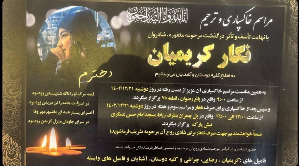 این تصاویری از مراسم خاکسپاری نگار کریمیان، زن جوان ۲۱ سالهای است که با شلیک مستقیم ماموران انتظامی در نزدیکی شهر الیگودرز استان لرستان کشته شد. مراسم خاکسپاری نگار کریمیان روز دوشنبه بیستویکم اسفندماه در آرامستان باغ رضوان اصفهان برگزار شده است.
