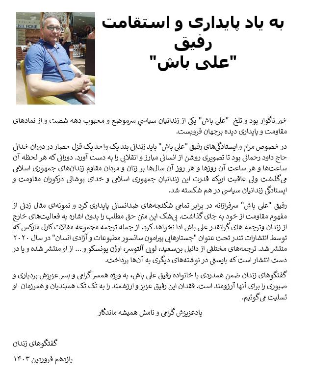 خبر ناگوار بود و تلخ «علی باش» یکی از زندانیان سیاسیِ سرموضع و محبوب دهه شصت و از نمادهای مقاومت و پایداری دیده برجهان فروبست.