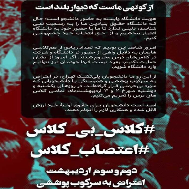 از این رو ما دانشجویان پلیتکنیک تهران، در اعتراض به سرکوب پوششی و همبستگی با دانشجویانی که مورد بیحرمتی قرار گرفتهاند، در روزهای یکشنبه و دوشنبه مورخ ۲ و ۳ اردیبهشت ماه، تمامی کلاسهای درس را تحریم میکنیم.