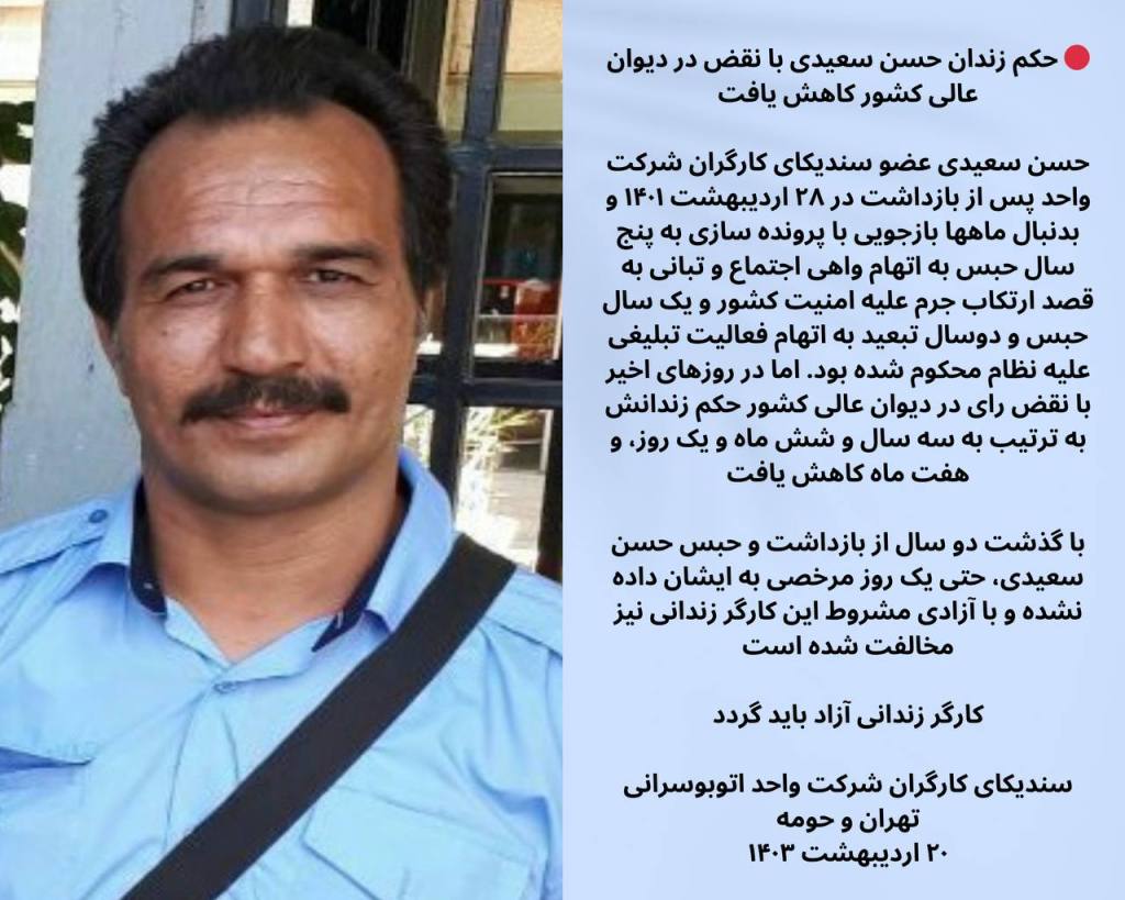 حسن سعیدی عضو سندیکای کارگران شرکت واحد پس از بازداشت در ۲۸ اردیبهشت ۱۴۰۱ و بدنبال ماهها بازجویی با پرونده سازی به پنج سال حبس به اتهام واهی اجتماع و تبانی به قصد ارتکاب جرم علیه امنیت کشور و یک سال حبس و دو سال تبعید به اتهام فعالیت تبلیغی علیه نظام محکوم شده بود. اما در روزهای اخیر با نقض رای در دیوان عالی کشور حکم زندانش به ترتیب به سه سال و شش ماه و یک روز بابت اتهام اجتماع و تبانی، و هفت ماه بابت اتهام فعالیت تبلیغی علیه نظام کاهش یافت. با گذشت دو سال از بازداشت و حبس حسن سعیدی، حتی یک روز مرخصی به ایشان داده نشده و با آزادی مشروط این کارگر زندانی نیز مخالفت شده است. کارگر زندانی آزاد باید گردد. سندیکای کارگران شرکت واحد اتوبوسرانی تهران و حومه ۲۰ اردیبهشت ۱۴۰۳ htps://www.instagram.com/vahedsyndica/ https://twitter.com/VahedSyndicate vsyndica@gmail.com https://t.me/vahedsyndica @Vahed_Syndica