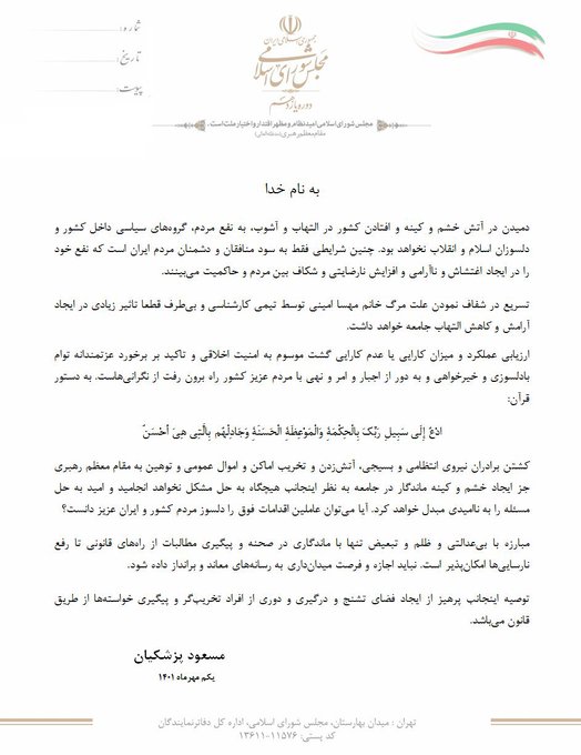 کشتن برادران نیروی انتظامی و بسیجی، آتش زدن و تخریب اماکن و اموال عمومی و توهین به مقام معظم رهبری جز ایجاد خشم وکینه ماندگار در جامعه به نظر اینجانب هیچگاه، به حل مشکل نخواهد انجامید و امید به حل مسئله را به ناامیدی مبدل خواهد کرد.