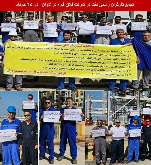 روز ۲۵ خرداد کارگران عملیاتی های معترض جنوب در شرکت نفت فلات قاره در لاوان برای پیگیری مطالبات خود تجمع کردند. اهم مطالبات: حذف نفوذیها و مدیران فاسد و نالایق، حذف سقفحقوق، حذف محدودیت حقسنوات بازنشستگی، اجرای کامل ماده۱۰و پرداخت معوقات آن، عدم تفکیک مشاغل در مناطق عملیاتی، استرداد مازاد مالیات کسر شده، اجرای سریع قانون بودجه۴۰۳ و اصلاح مالیات، اعمال هرچه سریعتر اپریزالها این ها مطالبات فوری و سراسری کارگران رسمی شاغل در نفت است.