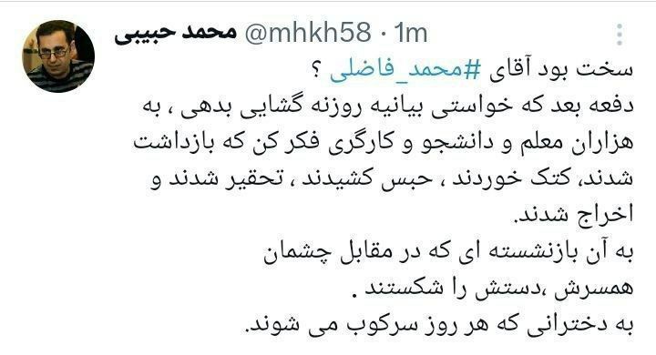دفعه بعد که خواستی بیانیه روزنهگشایی بدهی، به هزاران معلم و دانشجو و کارگری فکر کن که بازداشت شدند، کتک خوردند، حبس کشیدند، تحقیر شدند و اخراج شدند.