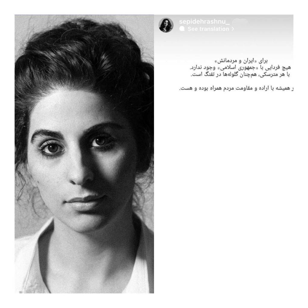 سپیده رشنو، فعال مدنی و از مخالفان حجاب اجباری، پیرامون انتخابات نمایشی جمهوری اسلامی: برای ایران و مردمانش هیچ فردایی با جمهوری اسلامی وجود ندارد. با هر مترسکی همچنان گلولهها در تفنگ است. تغییر همیشه با اراده و مقاومت مردم همراه بوده و هست.