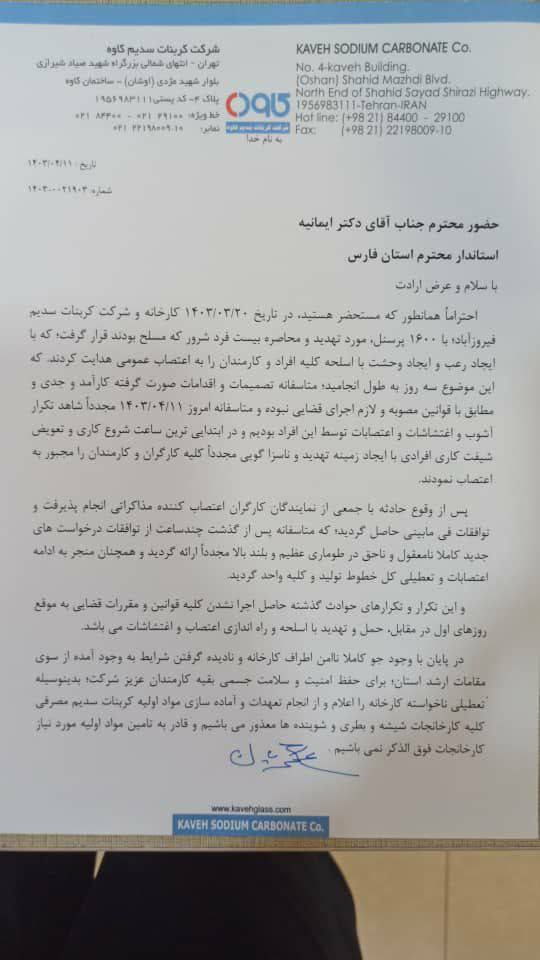 رئیس و موسس شرکت کربنات سدیم کاوه شهرستان فیروزآباد برای پیشگیری از ادامه اعتصابات، در نامهای به استانداری فارس و فرمانداری این شهرستان، کارگران معترض این شرکت را به «حمل سلاح» متهم کرده است.