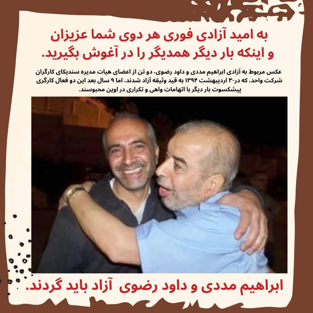 عکس مربوط به آزادی ابراهیم مددی و داود رضوی، دو تن از اعضای هیات مدیره سندیکای کارگرات شرکت واحد، که در ۳۰ اردیبهشت ۱۳۹۴ به قید وثیقه آزاد شدند، اما ۹ سال بعد این دو فعال کارگری پیشکسوت بار دیگر با اتهامات واهی و تکراری در اوین محبوسند. ابراهیم مددی و داود رضوی فوری و بدون قید و شرط آزاد باید گردند. کلیه فعالینکارگری و مدنی و زندانیان عقیدتی و سیاسی آزاد باید گردند! چاره کارگران وحدت و تشکیلات است. سندیکای کارگران شرکت واحد اتوبوسرانی تهران و حومه ۱۳ شهریور ۱۴۰۳