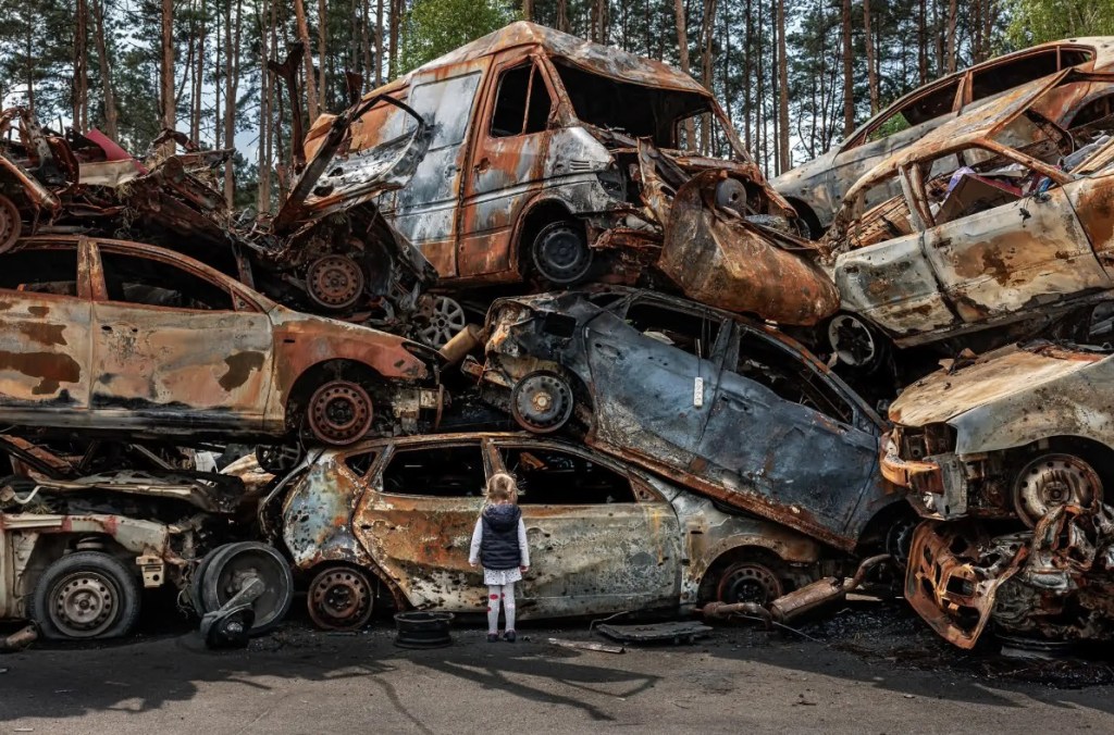 دخترک جوانی که در کنار کوهی از ماشینهای اسقاطی و زنگزده و تخریب شده، قرار دارد. این فضا که از آن به عنوان گورستان ماشینها یاد میشود با این عکس، پس از مدتی کوتاه به مکان توریستی جنگی تبدیل شده است.