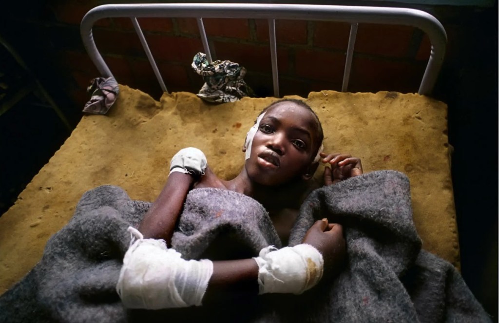 یک بازمانده توتسی از نسلکشی در روآندا در سال ۱۹۹۴ در تخت بیمارستان دراز کشیده است. میلشیاهای هوتو که به دنبال پاکسازی روآندا از توتسیها بودند، ۸۰۰۰۰۰ نفر را به کشتن دادند