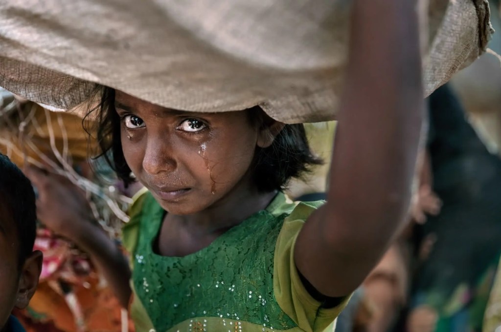 یک دختر روهینگیا پس از چند روز پیاده روی دچار کمخوابی شده و در حال گریستن است. او یکی از پناهجویانی است در آفتاب مانده برای فرار به بنگلادش است/ محصول سال ۲۰۱۷