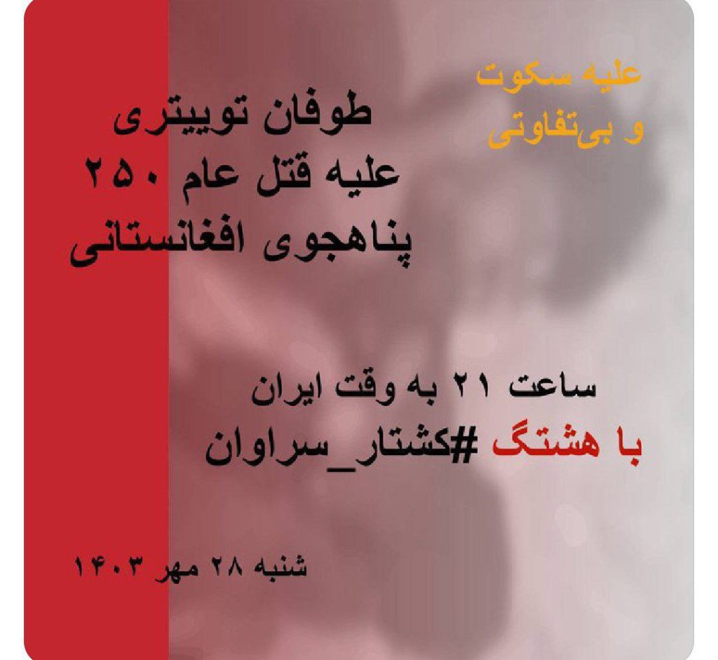 شنبه ۲۸ مهر ۱۴۰۳، ساعت ۲۱ به وقت ایران با هشتگ #کشتار_سراوان از کشتار سهمگین پناهجویان اهل افغانستان در شامگاه ۲۲ مهر در مرز کلهگان سراوان مینویسیم؛ از قتل عام حدود ۲۵۰ انسان به دست نیروهای جمهوری اسلامی ایران در سکوت خبری، که در صورت بیتفاوتیِ ما، مقدمهی دورانی بسیار تاریکتر و مرگبارتر برای منطقه است. صدای ضدیت با فاشیسم امروز باید از هر زمانی بلندتر باشد.