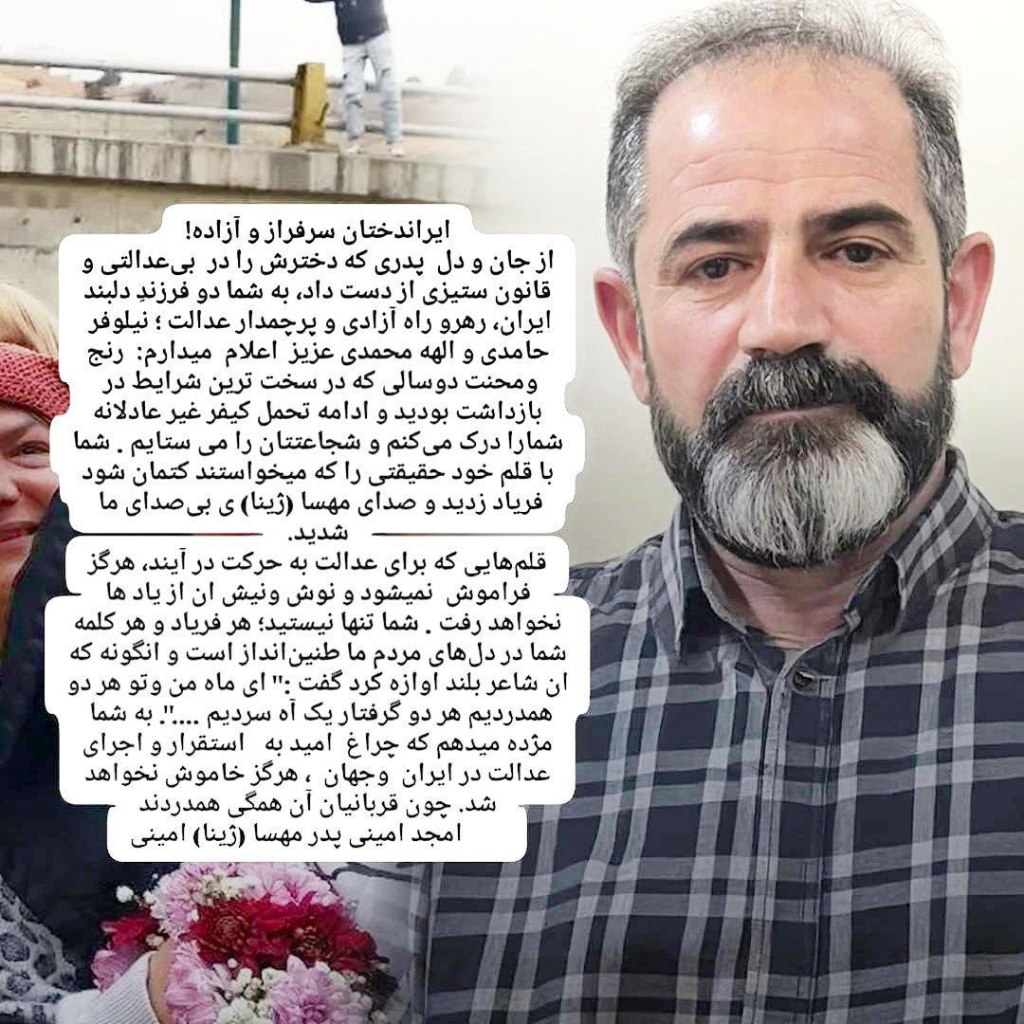 امجد امینی، پدر مهسا امینی، روز پنجشنبه سوم آبانماه در قالب یک استوری در صفحه اینستاگرام خود برای نیلوفر حامدی و الهه محمدی، دو خبرنگار شناختهشده که گزارشهایی درباره مرگ مهسا ژینا امینی تهیه کرده بودند، نوشت: «شما با قلم خود حقیقتی را که میخواستند کتمان شود فریاد زدید و صدای مهسا (ژینا)ی بیصدای ما شدید».