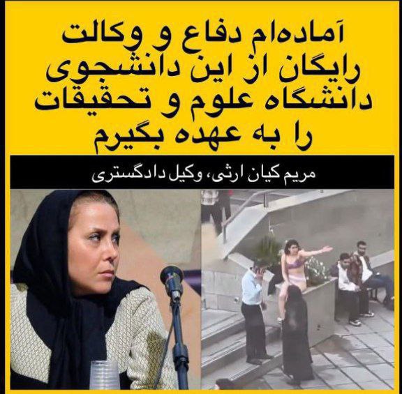 می دانیم که ایشان دستگیر شده و از این رو من مریم کیان ارثی آماده ام دفاع و وکالت رایگان از این دانشجوی دانشگاه علوم و تحقیقات را به عهده بگیرم.