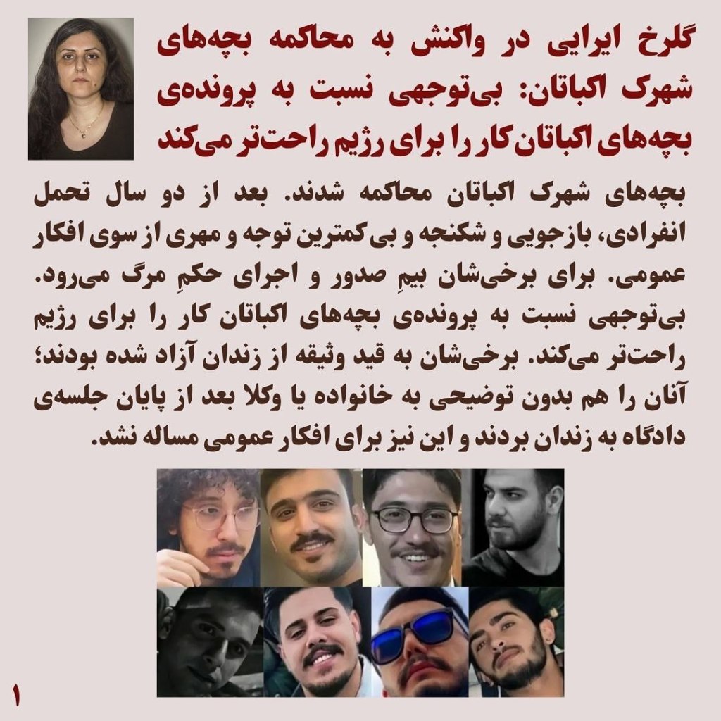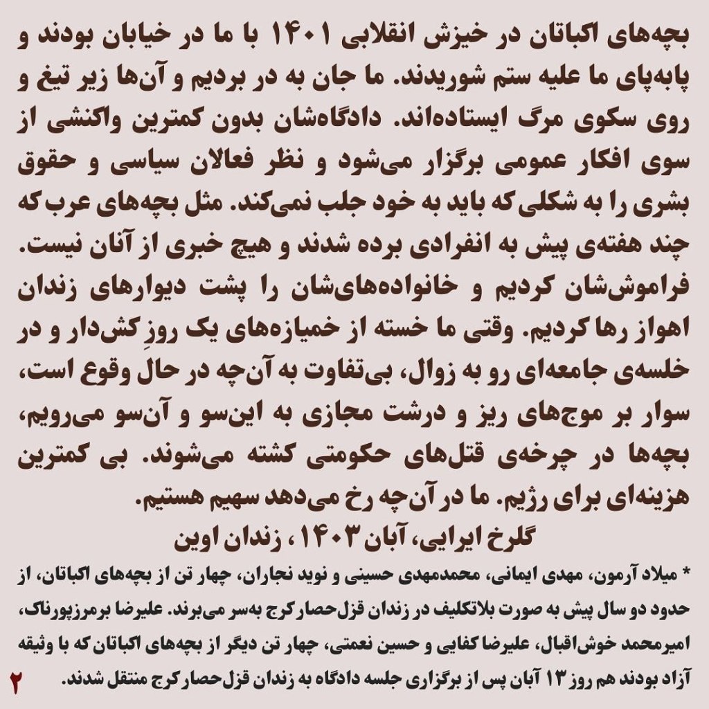 بعد از دو سال تحمل انفرادی، بازجویی وشکنجه و بی کمترین توجه و مهری از سوی افکار عمومی. برای برخی بیمِ صدور و اجرای حکمِ مرگ میرود. بیتوجهی نسبت به پروندهی بچههای اکباتان کار را برای رژیم راحتتر میکند. برخیشان به قید وثیقه آزاد شده بودند؛ آنان را هم بدون توضیحی به خانواده یا وکلا بعد از پایان جلسهی دادگاه به زندان بردند و این نیز برای افکار عمومی مساله نشد. بچههای اکباتان در خیزش انقلابی ۱۴۰۱ با ما در خیابان بودند و پابهپای ما علیه ستم شوریدند. ما جان به در بردیم و آنها زیر تیغ و روی سکوی مرگ ایستادهاند. دادگاهشان بدون کمترین واکنشی از سوی افکار عمومی برگزار میشود … مثل بچههای عرب که چند هفتهی پیش به انفرادی برده شدند و هیچ خبری از آنان نیست. فراموششان کردیم… در آنچه رخ میدهد سهیم هستیم.