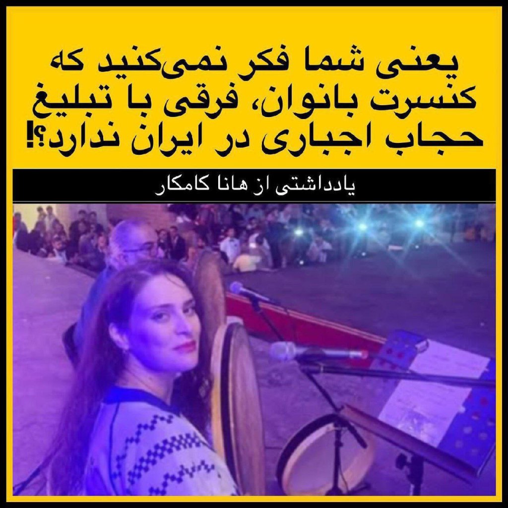 «جمع کنید این بساط مسخرهی کنسرت بانوان را !!! یعنی نمیدانید چه آسیبی به جنبش زنان خواننده برای مبارزه با ممنوعیت صدای زنان در ایران میزنید؟! یعنی شما یک دقیقه فکر نمیکنید که کنسرت بانوان فرقی با تبلیغ حجاب اجباری در ایران ندارد؟! یعنی درک نمیکنید که ما از هرگونه مجوزی که بگوید ما حق حضور در اجتماع با برابری جنسیتی نداریم را بیزاریم؟!»