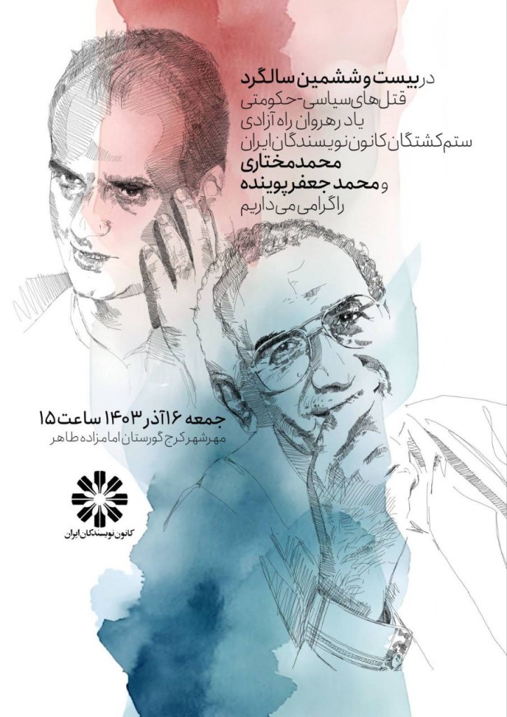 پوستر کانون نویسندگان ایران به مناسبت ۲۶اُمین سالگرد قتلهای سیاسی-حکومتی رهروان راه آزادی، ستمکشتگان کانون نویسندگان ایران، محمد مختاری و محمد جعفر پوینده