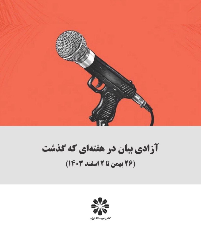 آزادی بیان در هفتهای که گذشت(۲۶ بهمن تا ۲ اسفند ۱۴۰۳) * بند اول منشور کانون نویسندگان ایران: آزادی اندیشه و بیان و نشر در همهی عرصههای حیات فردی و اجتماعی بیهیچ حصر و استثنا حقِ همگان است. این حق در انحصار هیچ فرد، گروه یا نهادی نیست و هیچکس را نمیتوان از آن محروم کرد.