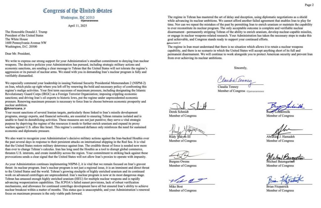 در آستانه دیدار مقامات آمریکایی با ایران در عمان، جمعی از نمایندگان کنگره در نامهای به دونالد ترامپ اعلام کردند:▪️ «مقامهای ایرانی در بهرهگیری از مذاکرات دیپلماتیک برای خرید زمان و پیگیری اهداف خود تجربه دارند و گاه این روند به تعویق تصمیمات کلیدی منجر شده است. ما نباید توافقی دیگر را بپذیریم که به ایران اجازه دهد وقت بخرد و برنامه هستهایاش را حفظ کند.»▪️ در این نامه همچنین تأکید شده: «نباید اشتباهات گذشته تکرار شود. ایران نباید اجازه غنیسازی اورانیوم یا حفظ زیرساختهای برنامه هستهایاش را داشته باشد. تنها نتیجه قابل قبول، خلع سلاح کامل و قابلراستیآزمایی ایران، محرومسازی دائم از توان غنیسازی، توسعه موشکهای هستهای و تحقیقات مرتبط است.»