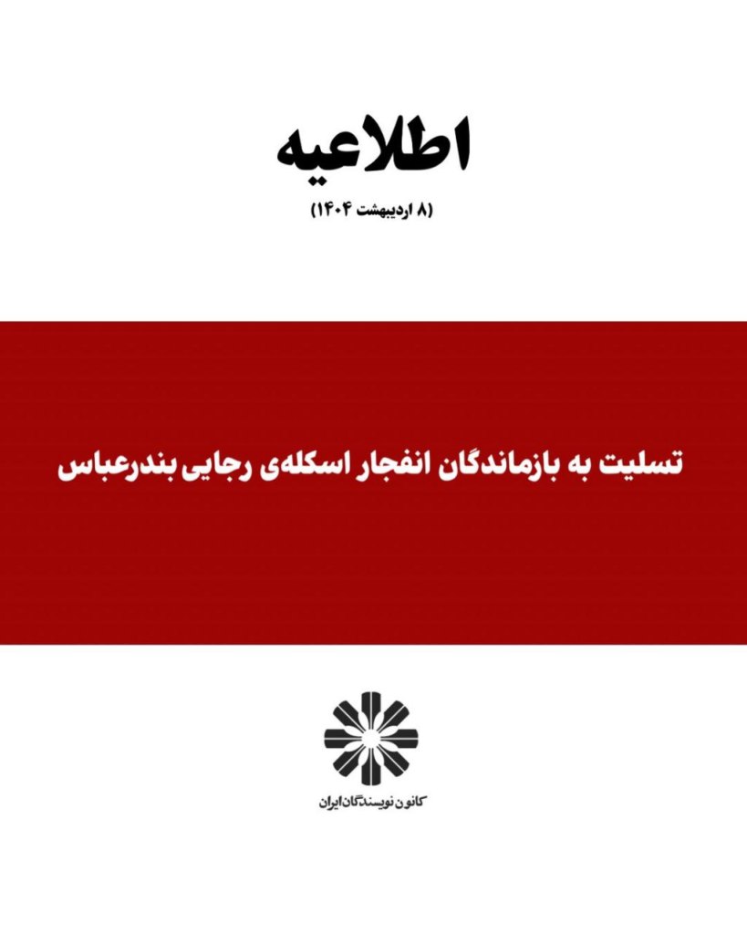 ▪️کانون نویسندگان ایران درگذشت هموطنان در انفجار اسکلهی رجایی را به بازماندگان و مردم ایران تسلیت میگوید و خواهان اطلاعرسانی شفاف و روشن شدن همهی ابعاد این فاجعه است و از مردم آزادهی ایران میخواهد در غیاب مسئولیتپذیری حاکمیت، از یاری به آسیبدیدگان دریغ نورزند.