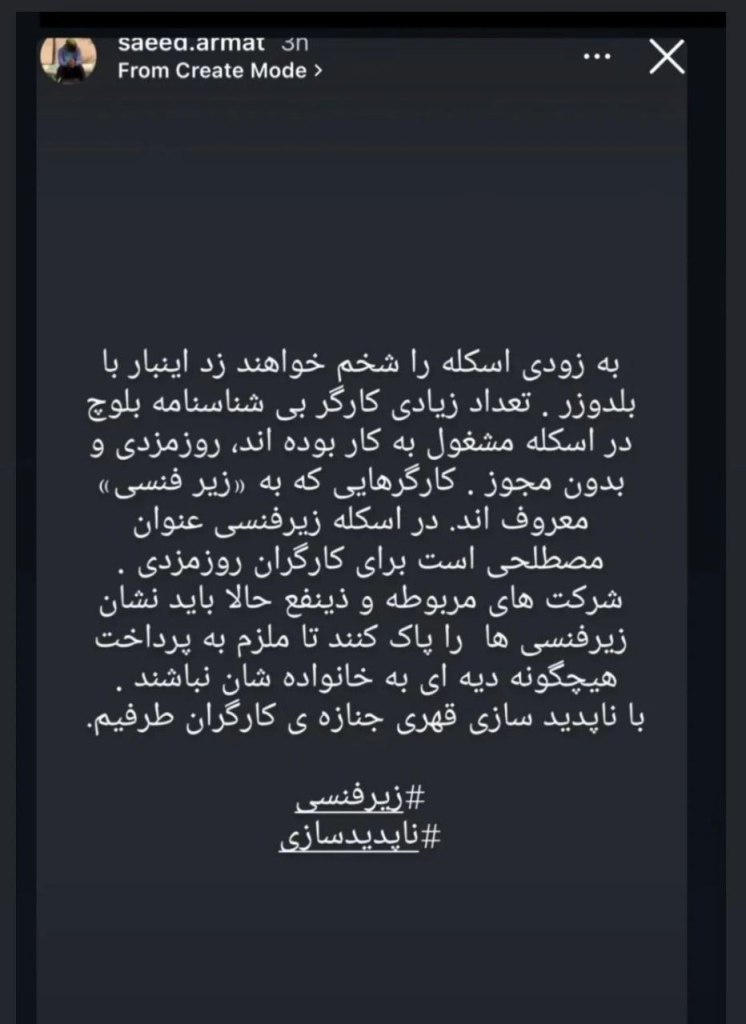 اینها کارگرانیاند که از روستاهای محروم بلوچستان آمدهاند، برای لقمه نانی، با دستمزد پایین، بدون بیمه و امنیت.