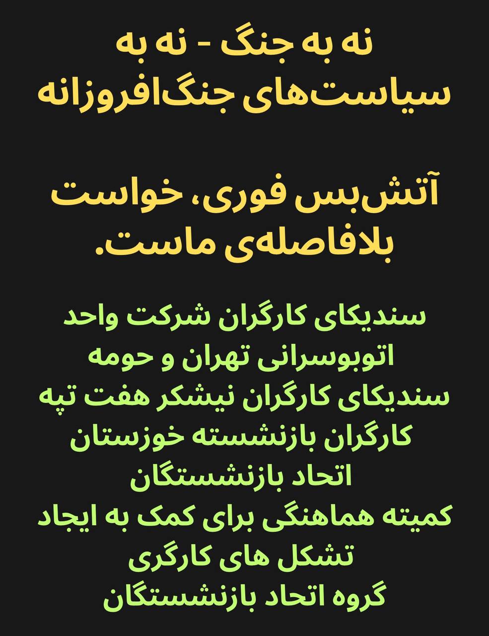 تشکلهای امضاکنندهی این بیانیه از تمامی تشکلهای کارگری، نهادهای حقوق بشری، گروههای ضدجنگ، فعالان زیستمحیطی و نیروهای صلحطلب در سراسر جهان میخواهند که یکصدا خواهان توقف فوری جنگ، بمباران، کشتار مردم بیگناه و تخریب محیطزیست شوند و از مبارزات مردم ایران و منطقه برای پایاندادن به نسلکشی، جنگافروزی و سرکوب حمایت کنند.