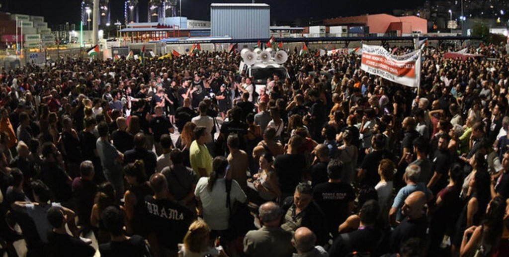 چهارشنبه شب، بسیج عمومی و رزمنده ای علیه انتقال تجهیزات نظامی به دولت قاتل اسرائیل، در اسکلههای دو و سه بندرِ پیرائوسِ یونان برگزار شد.