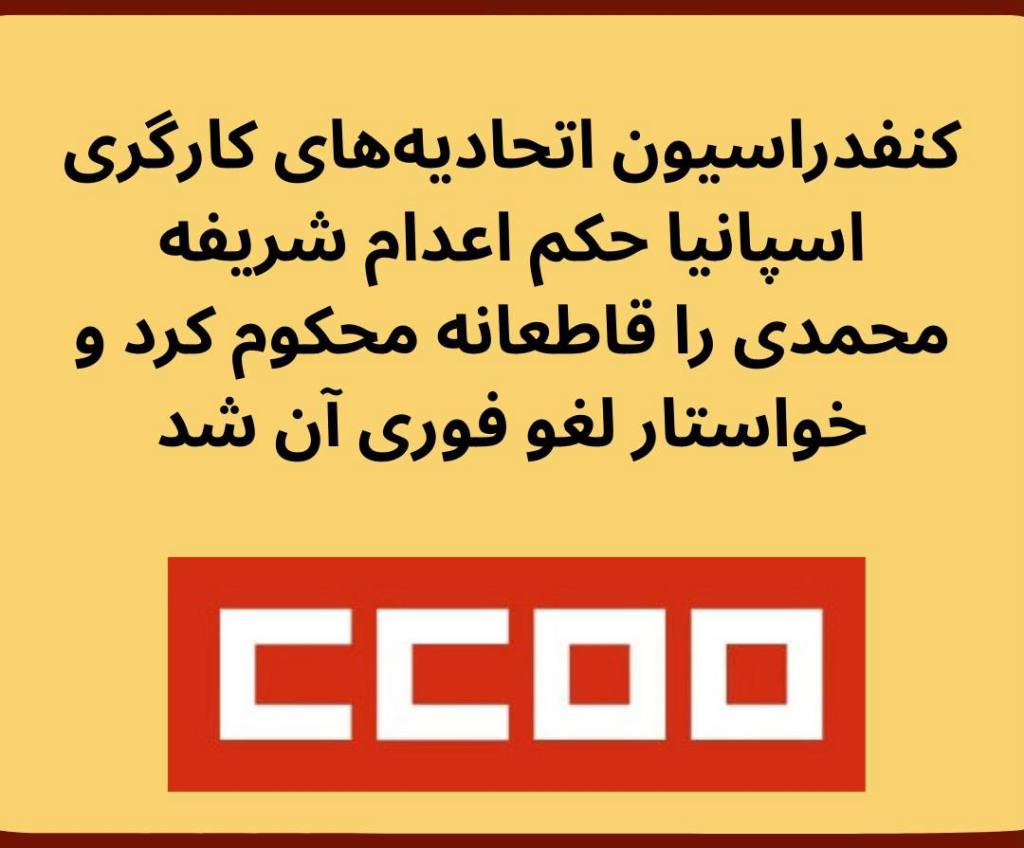 ما، کنفدراسیون اتحادیههای کارگری اسپانیا، «کمیسیونهای کارگران»، با این نامه از شما میخواهیم فوراً برای لغو حکم غیرقانونی و غیرانسانی اعدام که علیه شریفه محمدی، فعال شناختهشدهی کارگری و حقوق زنان در ایران، صادر و اخیراً تأیید شده است، اقدام کنید.