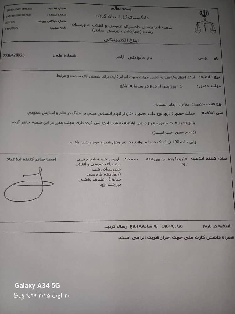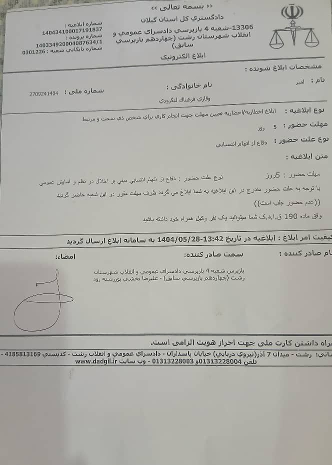 چهار نفر از فعالان بازنشستگان گیلان که در تجمعات روزهای یکشنبه شرکت می کنند به دادسرای گیلان احضار شدند . #یونس_آزادبر ،#شهره_کسایی، #امیر_وقاری_فرهناک_لنگرودی و #ابراهیم_دانش_پژوه به اتهام اخلال در نظم عمومی ، در تاریخ در بازرسی حاضر شوند . شورای هماهنگی تشکل های صنفی فرهنگیان ایران ضمن محکومیت افزایش فشار ها بر جنبش های مطالبه گر اجتماعی ( معلمان ، کارگران ، بازنشستگان ) خواهان پایان سرکوب ها و فشار بر فعالین صنفی شده و به حاکمیت هشدار می دهد که با ادامه این روند حداقل مشروعیت موجود را نیز از دست خواهد داد .