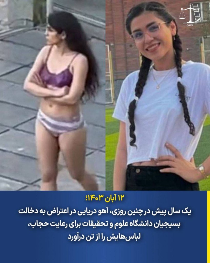 ۱۲ آبان ۱۴۰۳، سالگرد بازداشت آهو دریایی است، دانشجو و مادری جوان که بهگفته نزدیکانش با شجاعت بارها مقابل آزارگران حجاب ایستاده بود. یک سال پیش، او در واکنش به دخالت بسیجیان در محیط دانشگاه، لباسی از تن درآورد. پس از این رخداد، روابط اجتماعی و خانوادگی او تحت فشار قرار گرفت و نزدیکان گفتند خانواده و اطرافیانش در معرض تهدید و ارعاب قرار گرفتند.