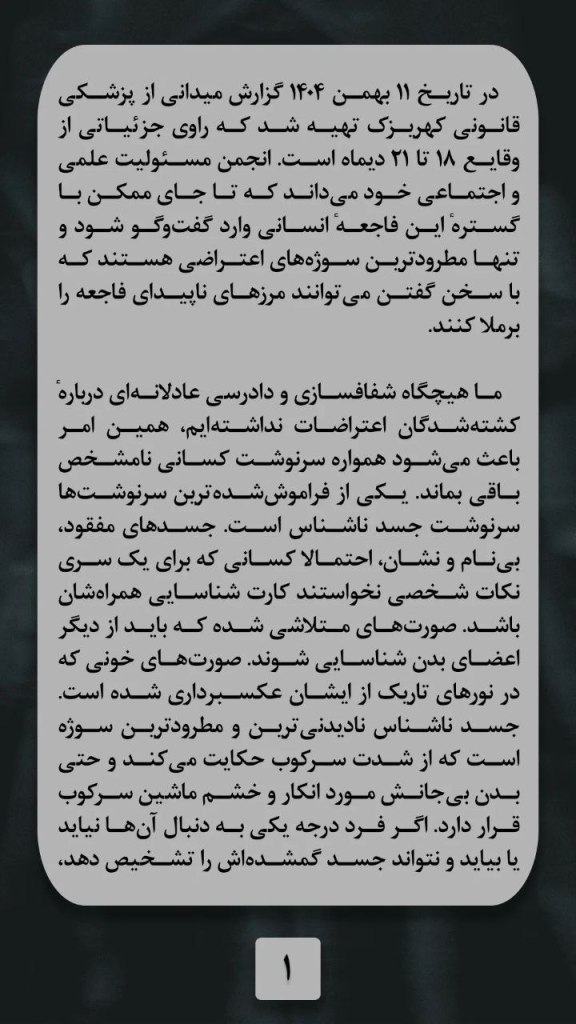 در تاریخ یازده بهمن هزار و چهارصد و چهار گزارش میدانی از پزشکی قانونی کهریزک تهیه شد که راوی جزئیاتی از وقایع هیجدهم تا بیست و یکم دیماه است. انجمن مسئولیت علمی و اجتماعی خود می داند که تا جای ممکن با گستره ی این فاجعه ی انسانی وارد گفتگو شود و تنها مطرودترین سوژه های اعتراضی هستند که با سخن گفتن می توانند مرزهای ناپیدای فاجعه را برملا کنند.