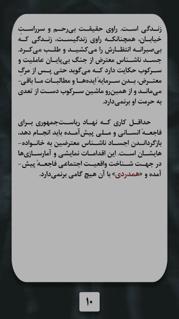 حداقل کاری که نهاد ریاست جمهوری برای فاجعه انسانی و ملی پیش آمده باید انجام دهد، بازگرداندن اجساد ناشناس معترضین به خانواده هایشان است. این اقدامات نمایشی و آمارسازی ها در جهت شناخت واقعیت اجتماعی فاجعه پیش آمده و « همدردی » با آن هیچ گامی برنمی دارد.