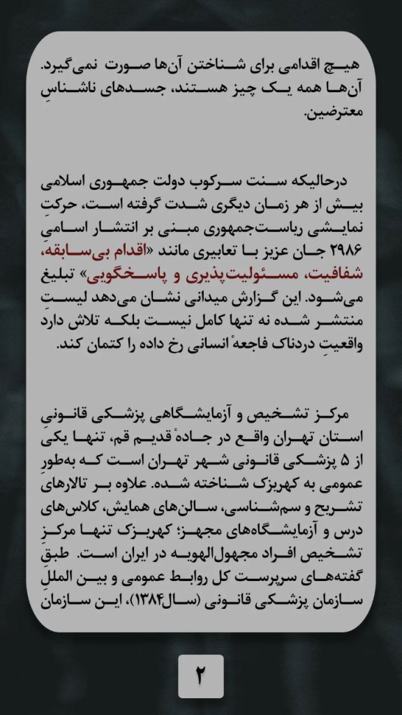در حالیکه سُنّتِ سرکوب دولت جمهوری اسلامی بیش از هر زمان دیگری شدت گرفته است، حرکت نمایشی ی ریاستِ جمهوری مبنی بر انتشار اسامی دوهزار و نهصد و هشتاد و شش جانِ عزیز با تعابیری مانندِ «اقدام بی سابقه، شفافیّت مسئولیت پذیری، و پاسخگوئی» تبلیغ می شود، این گزارش میدانی نشان می دهد لیستِ منتشر شده نه تنها کامل نیست، بلکه تلاش دارد واقعیتِ دردناکِ فاجعه ی انسانی ی رخ داده را کتمان کند. مرکز تشخیص و آزمایشگاهی پزشکی قانونی استانِ تهران واقع در جاده ی قدیم قُم، تنها یکی از از پنج پزشکی قانونی شهر تهران است که به طورِ عمومی به کهریزک شناخته شده، علاوه بر تالارهای تشریح و سم شناسی، سالن های همایش، کلاس های درس و آزمایشگاه های مجهز، کهریزک تنها مرکز تشخیص افراد مجهول الهویه در ایران است. طبق گفته های سرپرست کُل روابط عمومی و بین المللِ سازمان پزشکی قانونی (سال 1384)، این سازمان نشانِ بزرگترین مرکز شناسائی افراد مجهول الهویه در خاورمیانه را نیز بر سینه دارد. سوای از این همه امکانات، در سال هزار و چهارصد از سوله های بحران بهره برداری می شود که برای فجایع طبیعی و از قرار معلوم اجتماعی-سیاسی با تلفاتِ بالا تدارک دیده شده است. تمام اجساد کشته شده گان اعتراضات تهران یا در بیمارستان ها نگاه داشته می شوند و یا به کهریزک منتقل شده اند. هرچند احتمال اینکه در حال حاضر جسد ناشناسی در بیمارستان ها باقی مانده باشد بسیار کم است.