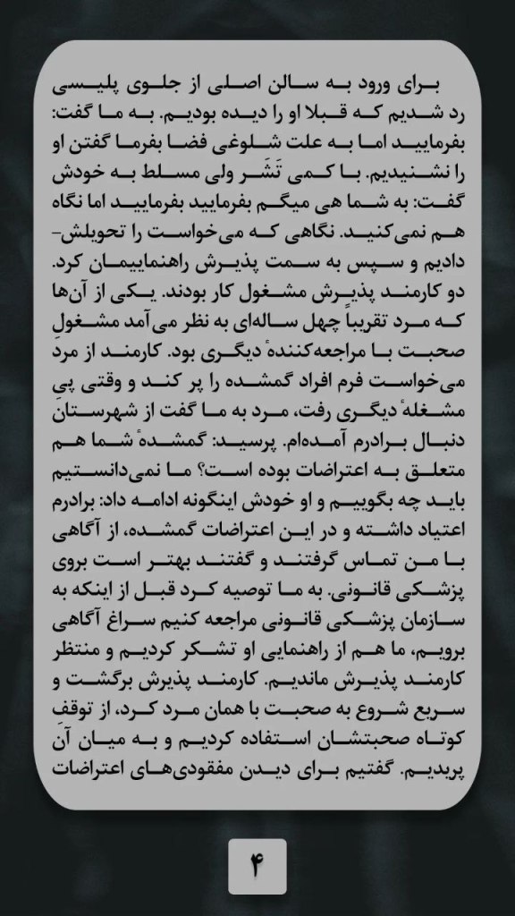 یکی از آنها که مرد تقریبا چهل ساله ای به نظر می امد مشغول صحبت با مراجعه کننده دیگری بود. کارمند از مرد می خواست فرم افراد گم شده را پر کند و وقتی پی مشغله دیگری رفت مرد به ما گفت از شهرستان دنبال برادرم آمده ام. پرسید گمشده شما هم متعلق به اعتراضات بوده است؟ ما نمی دانستیم باید چه بگوئیم. او خودش اینگونه ادامه داد برادرم اعتیاد داشته و در این اعتراضات گم شده، از آگاهی با من تماس گرفتند و گفتند بهتر است بروی پزشکی قانونی. به ما توصیه کرد قبل از اینکه به سازمان پزشکی قانونی مراجعه کنیم سراغ آگاهی برویم. ما هم از راهنمایی او تشکر کردیم و منتظر کارمند پذیرش ماندیم. کارمند پذیرش برگشت و سریع شروع به صبحت با همان مرد کرد. از توقف کوتاه صحبت شان استفاده کردیم و به میان آن پریدیم، گفتیم برای دیدن مفقودی های اعتراضات آمدیم، تاریخش را پرسید، گفتیم بیست و یکم دی ماه. سپس از ما خواست بیشتر صبر کنیم. فکر می کردیم احتمالا رویه های پیچیده و سخت گیرانه دیگری در کار است. خدا خدا می کردیم پولی از ما نخواهند، چون تنها اعتباری که همراه داشتیم اعتبار کارت مترویی بود که با آن خودمان را به کهریزک رسانده بودیم.