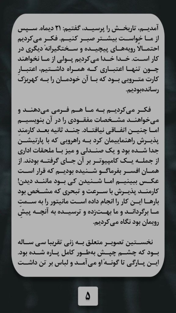 فکر می کردیم به ما هم فرمی می دهند و می خواهند مشخصات مفقودی را در آن بنویسیم. اما چنین اتفاقی نیفتاد. چند ثانیه بعد کارمند پذیرش راهنماییمان کرد به راهرویی که با پارتیشن جدا شده بود و یک صندلی و میز با ملحقات اداری از جمله یک کامپیوتر بر آن جای گرفته بودند. ازهمان افسر بفرماگو شنیده بودیم که قرار است عکس ببینیم. اما شنیدن کی بود مانند دیدن! کارمند پذیرش با سرعت و تبحری که مشخص بود که بارها این کار را انجام داده است مونیتور را به سمت ما برگرداند و ما بهت زده و ترسیده به آنجه پیش روی ما بود نگاه می کردیم.