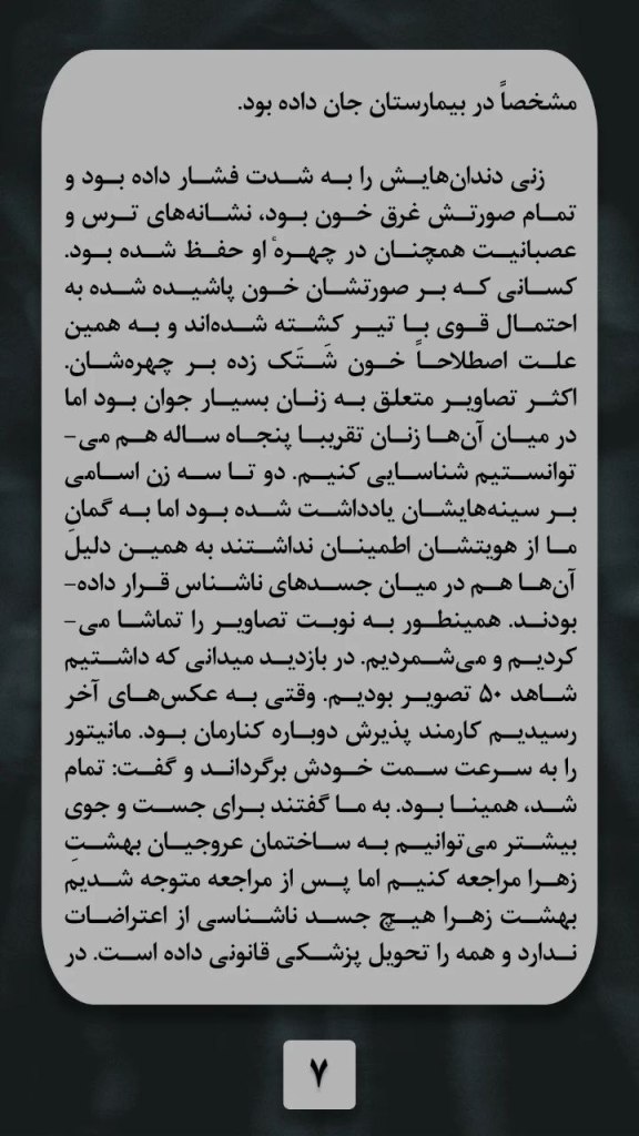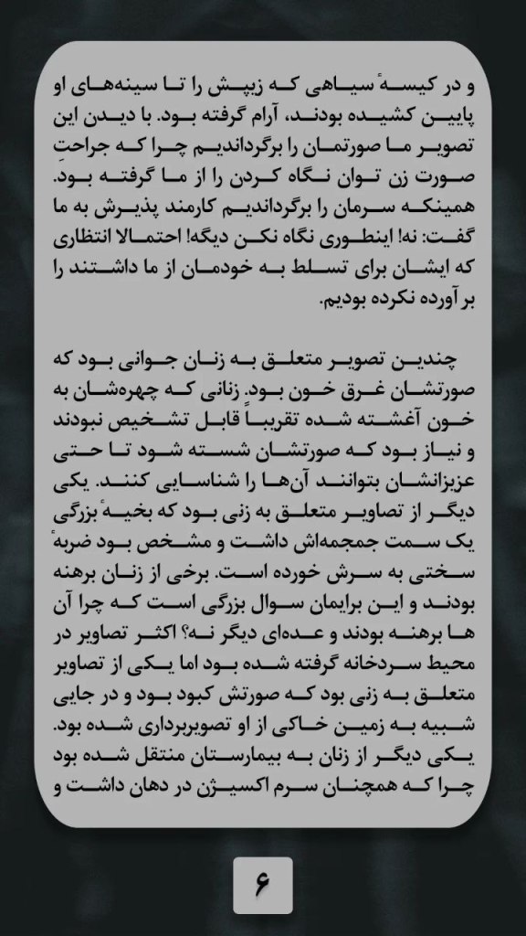 چندین تصویر متعلق به زنان جوانی بود که صورتشان غرق خون بود. زنانی که چهره شان به خون آغشته شده تقریبا قابل تشخیص نبودند و نیاز بود که صورتشان شسته شود تا حتی عزیزانشان بتوانند آنها را شناسایی کنند. یکی دیگر از تصاویر متعلق به زنی بود که بخیه بزرگی یک سمت جمجمه اش داشت و مشخص بود ضربه سختی به سرش خورده است. برخی از زنان برهنه بودند، این برایمان سوال بزرگی است که چرا آنها برهنه بودند و عده دیگر نه؟ اکثر تصاویر در محیط سردخانه گرفته شده بود، اما یکی از تصاویر متعلق به زنی بود که صورتش کبود بود و در جایی شبیه به زمین خاکی از او تصویربرداری شده بود. یکی دیگر از زنان به بیمارستان منتقل شده بود، چرا که همچنان سرم اکسیژن در دهان داشت و مشخصا در بیمارستان جان داده بود.