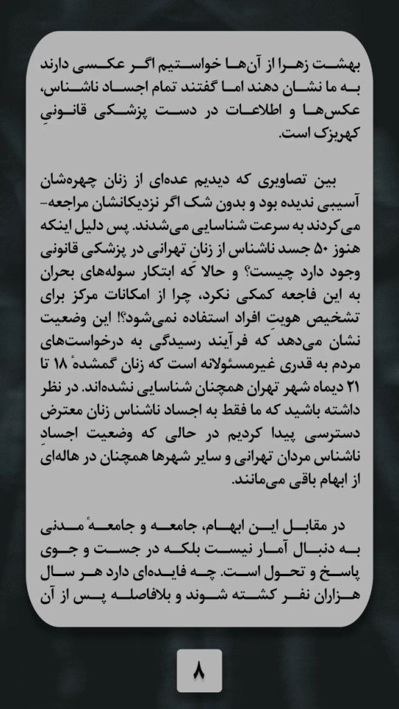 بین تصاویری که دیدیم عده از زنان چهره اشان آسیبی ندیده بود و بدون شکّ اگر نزدیکانشان مراجعه می کردند به سرعت شناسائی می شدند. پس دلیل اینکه هنوز پنجاه جسد ناشناس از زنان تهرانی در پزشکی قانونی وجود دارد چیست؟ و حالا که ابتکار سوله های بحران به فاجعه کمکی نکرد، چرا از امکانات مرکز برای تشخیص هویت افراد استفاده نمی شود؟ این وضعیت نشان می دهد که فرایند رسیدگی به درخواست های مردم به قدری غیرمسئولانه است که زنان گمشده ی هیجدهم تا بیبست و یکم دیماه شهرِ تهران همچنان شناسائی نشده اند. در نظر داشته باشید که ما فقط به اجساد ناشناس زنان معترض دسترسی پیدا کردیم، در حالیکه وضعیت اجسادِ ناشناس مردان تهرانی و سایر شهرها همچنان در هاله ای از ابهام باقی می مانند.