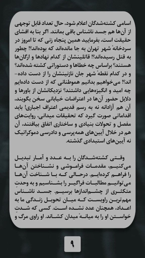 وقتی کشته شدگان را به عدد و آمار تبدیل می کنیم، مقدمات فراموشی و نشناختن آن ها را فراهم کرده ایم. در حالی که با شناخت آن ها می توانیم مطالبات فراگیر را بشناسیم و به وحدت متکثری از چشم اندازها برسیم. جسد ناشناس مهم ترین راویست که میان تحویل زندگی ما به اعداد، همچنان عدد نشده است. کسی که شدت خواستن او را به میانه میدان کشاند. او راوی مرگ و زندگی است. راوی حقیقت بی رحم و سرراست خیابان، همچنانکه راوی زندگیست، زندگی که بی صبرانه انتظارش رامی کشید و طلب می کرد. جسد ناشناس معترض از جنگ بی پایان عاملیت و سرکوب حکایت دارد که می گوید حتی پس از مرگ معترض، بدن سرمایه ایده ها و مطالبات ما باقی می ماند و از همین رو ماشین سرکوب دست از تعدی به حرمت او برنمی دارد.