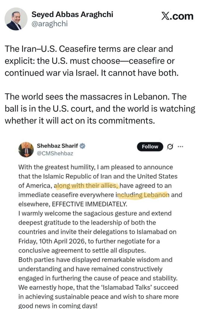 - عباس عراقچی، وزیر امور خارجه جمهوری اسلامی با بازنشر نوشته شهباز شریف، نخستوزیر پاکستان درباره توافق آتشبس نوشت: «شروط آتشبس میان ایران و ایالات متحده روشن و صریح است: ایالات متحده باید انتخاب کند؛ یا آتشبس، یا تداوم جنگ به واسطه اسرائیل. نمیتوان هر دو را با هم داشت. دنیا نظارهگر کشتارها در لبنان است. اکنون توپ در زمین ایالات متحده است و تمام جهان تماشا میکند که آیا این کشور به تعهدات خود عمل خواهد کرد یا خیر.»